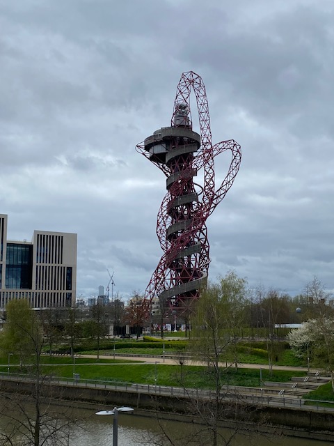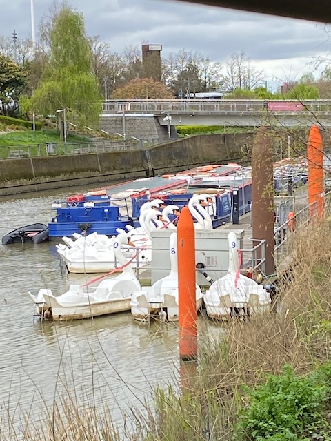 Whilst you’re at this spot, you can look over to the Olympic Park and see the ArcelorMittal Orbit sculpture by Anish Kapoor. He created it for the 2012 London Olympic Games. It’s a red lattice tower with a lift that takes you to the viewing platforms where you will have panoramic views of London. It’s then possible to experience a very long slide back down to the ground or else you can take the more traditional route via a staircase. And it’s worth looking at the waterfront too, where on a fine day, it’s possible to take out a swan pedalo or just amble along the front and watch the world go by. The river is an artificial channel that flows into the Bow Creek part of the River Lea.