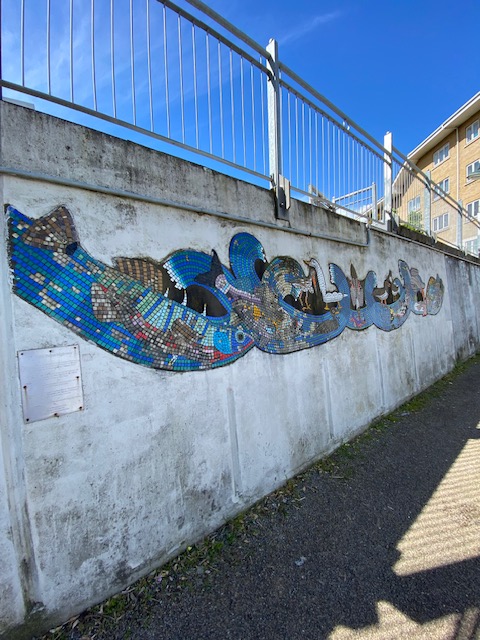 Continue walking along Riverside Walk and you’ll see a mosaic entitled Wildlife Superhighway. The inscription on the nearby plaque states “This mosaic was designed by local people to reflect the wildlife and beauty of the river Thames in Bexley. The tidal Thames provides a home for 118 species of fish and is the cleanest big city estuary in the world.” It was created by a local primary school and is one of three mosaics (though it doesn’t say where the other two are).