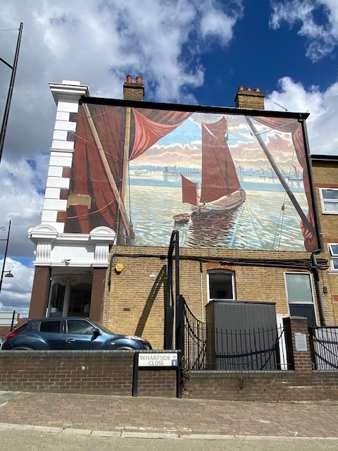 There is a considerable amount to be seen around here so be prepared to walk some distance. The bus stops opposite the White Hart pub where there is a lovely Thames Barge mural on the exterior wall. It’s the creation of artist Gary Drostle and it depicts a traditional Thames Spritsail Barge approaching the Erith shore at the end of the 19th century. The barge here is “The Chance” which had been skippered by a local character known as Robert “The Devil” Austen, who was a frequent drinker at the White Hart. Drostle used a technique known as trompe l’oeil and he painted over existing structures and pipes, which helped create a more theatrical appearance. There’s a sense of looking through a theatre curtain which is actually sails of other boats.