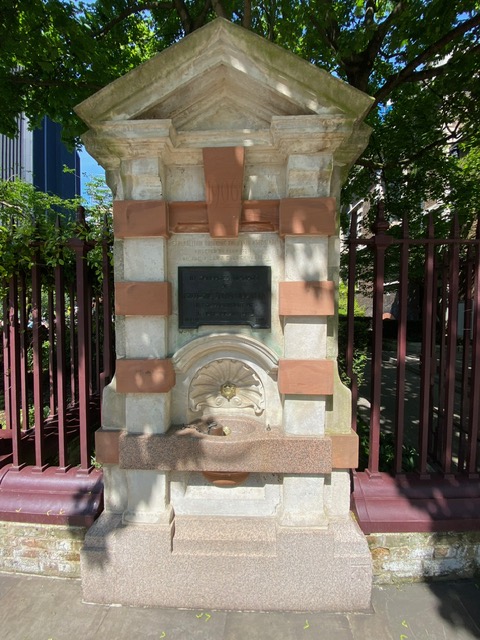 Outside the church is a drinking fountain with a dedication to Frederic Mocatta, a financier and philanthropist. These fountains were first erected in 1859 in London and by 1900, there were more than 500. They were placed to provide clean drinking water, especially for the working classes and the homeless as medical research had linked cholera epidemics to polluted water.
