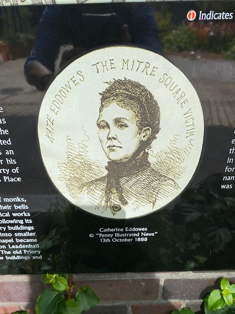 We then walked to the site of the Holy Trinity Priory, founded around 1108 as stated above, by Queen Mathilda. It was dissolved during the time of Henry VIII and came to be given to the Duke of Norfolk and henceforward known as Duke’s Place – now also the name of the bus stop. At the site of the Priory is a plaque to commemorate the fourth of Jack the Ripper’s victims, Catherine Eddowes as it was very near that she was found on the 30th of September 1888.