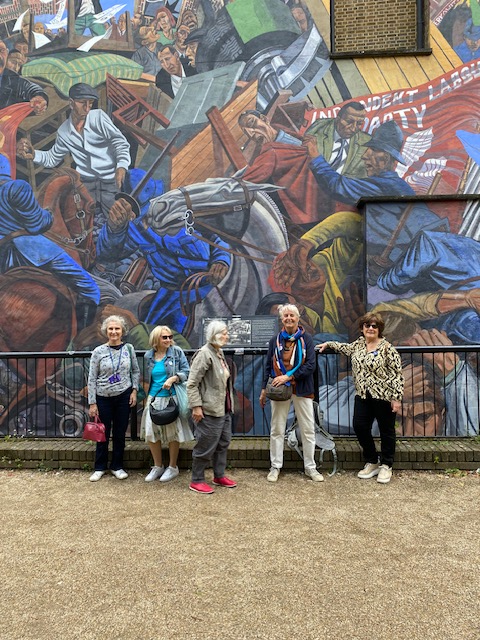 Before getting on the bus at Shadwell, we walked round to St George’s Gardens where there is a very large mural of the Battle of Cable Street. The Battle took place on the 4th October 1936. It happened because the British Union of Fascists, led by Oswald Moseley, was going to march through this area of East London. This was a direct provocation to the predominantly Jewish Community living in this area at the time. People from this community, along with communists, trade unions, Labour party members, dockers and labourers all joined forces to stop the march happening.