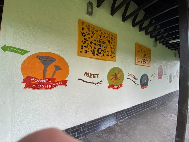 Scattered throughout the grounds are tubs and troughs, filled with flowers and other flora, to attract bees and butterflies. In the 9 acres of woodland, grassland and scrub, it’s also possible to find worms and lizards. The colourful new entrance gate, welcome sign and mural were the creation of artist Matt Ponting, with input from volunteers and local residents.