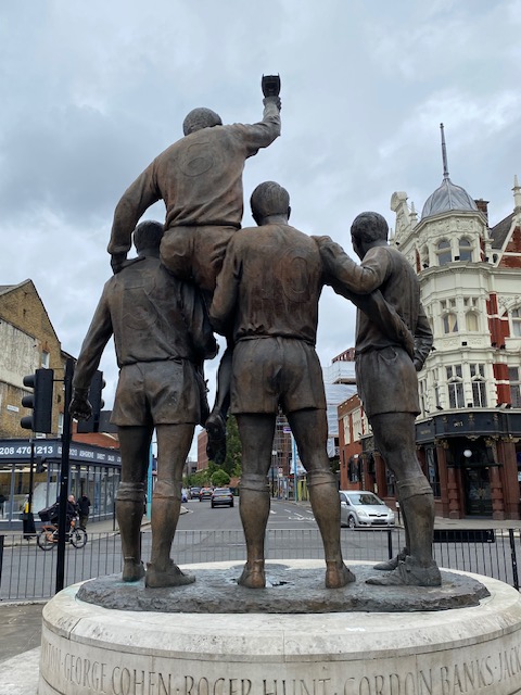 Round the corner from the shop is a large mural of two former West Ham FC players – Trevor Brooking and Billy Bonds. And on the football theme, along the road is a large bronze statue of “The Champions” the four West Ham players who helped England to victory in the World Cup 1966. They are Bobby Moore, Geoff Hurst, Martin Peters and Ray Wilson. The names of the rest of the team are etched on the pedestal of the sculpture.
