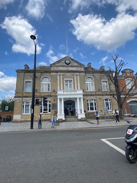 Southall Town Hall is also on the 95 bus route. Its foundation stone wasn laid in 1897. The building has a symmetrical main frontage with five bays facing onto the High Street; the central section featured a porch with Doric columns on the ground floor and there was a window with a balcony flanked by Doric pilasters on the first floor. Above this is a pediment containing a clock. On the side of building are some blue plaques, one of which is for Gurdip Singh Chaggar an 18 year old Sikh student who was brutally killed near this spot in 1976, and another is for Blair Peach, a teacher who had been killed in an anti-riotism demonstration on the 23rd April 1979.