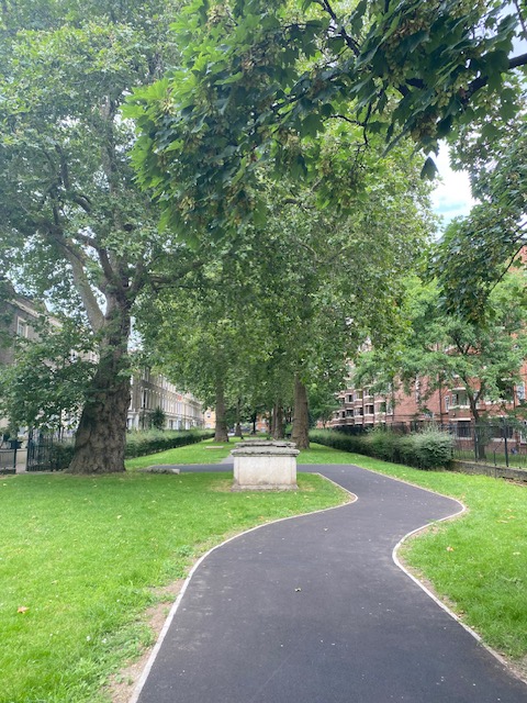 The local people buried here included members of the Frampton family. The last burial here took place in 1876. Approval was given in 1884 to turn the site into a garden, as long as the principal gravestones were left in their present position, evergreens were to be planted round the site and graves were lowered where necessary to remove all headstones and place them against the walls. In 1888, a passage was built to connect the garden with St. Thomas’s Recreation Ground.