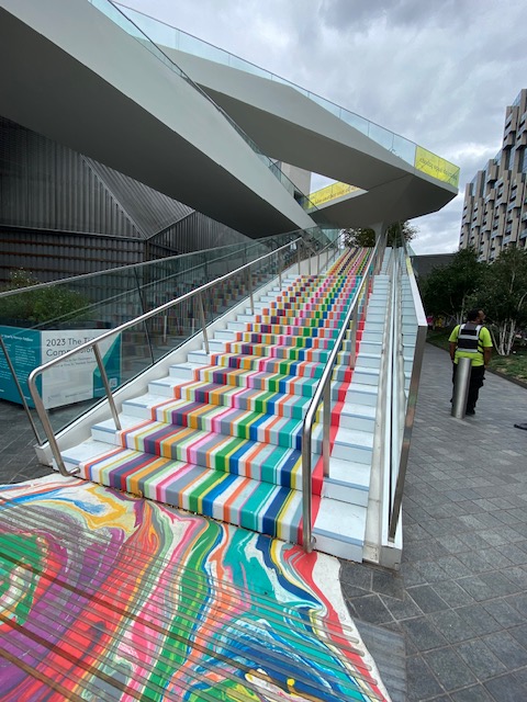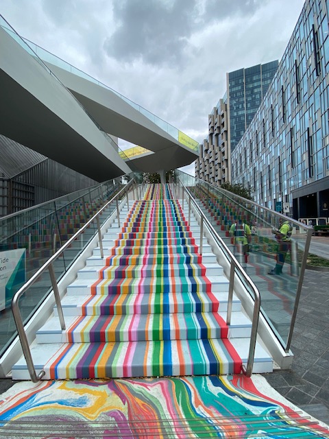 Outside the NOW gallery, is the Poured Staircase by Turner Prize nominee, Ian Davenport. He has created an immersive river of colour that cascades down The Tide staircase in parallel candy-coloured stripes. Davenport uses the force of the elements such as gravity as important themes in his artwork. In recent years, his work has consisted of carefully poured lines of acrylic paint down a surface, which puddle and pool at the bottom. You can’t help but smile when you gaze at the staircase and watch everyone’s reaction as they walk up and down. I managed to get a photo of the staircase while no-one was on it.