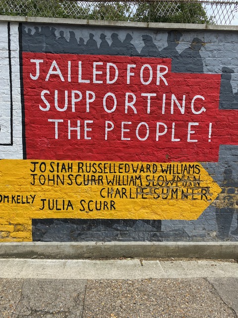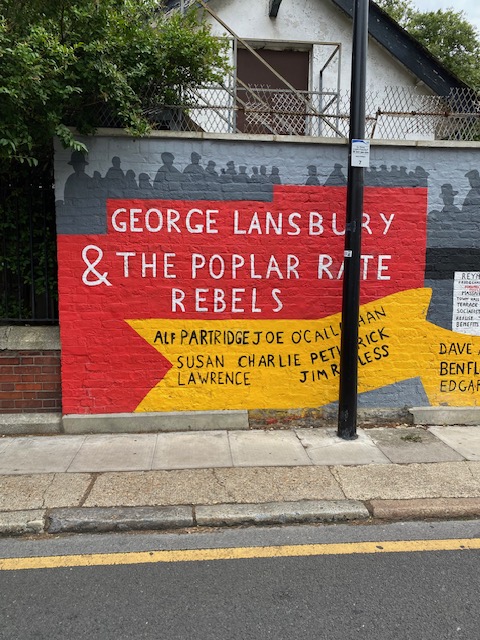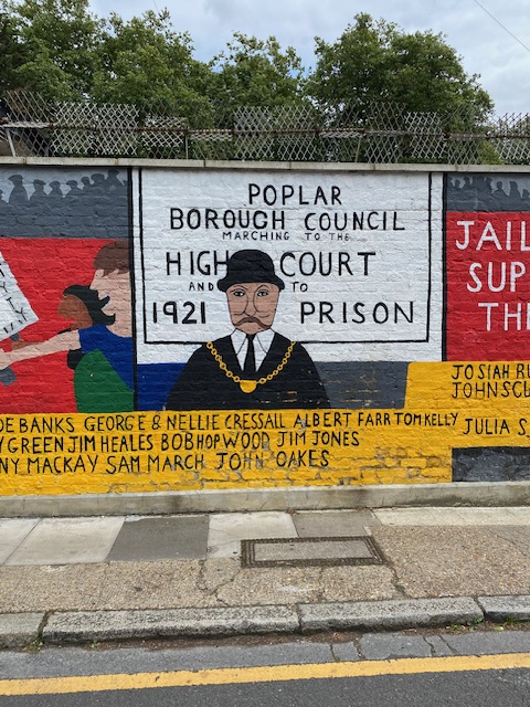 A few minutes’ walk from the chihuahua is a mural of a very different kind, called the Poplar Rates Rebellion mural. In 1921, faced with the prospect of a large increase in the rates, Poplar BC decided to hold them down by not collecting the precepts that should have been passed on to cross-London authorities, who responded by taking the matter to the High Court. The council’s response was to organise a procession of 2,000 supporters from Bow on 28 July 1921, led by Poplar’s official mace-bearer, accompanied by a band & a banner stating, “Poplar BC marching to the High Court & possibly to prison”.