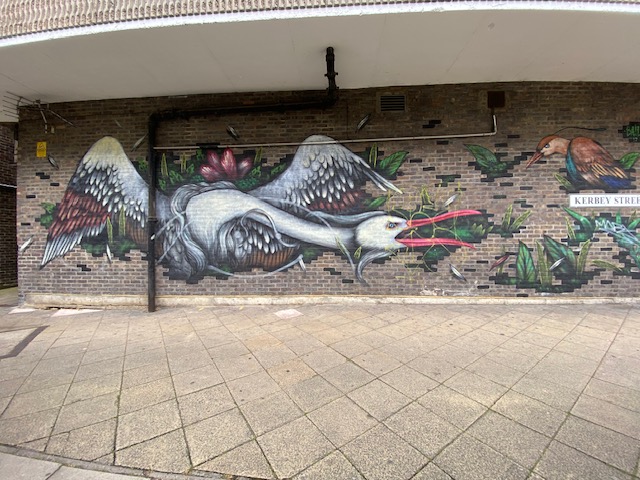 On the way back to the bus stop, in Kerbey Street, is another mural, by Brazilian street artist Bailon. Apparently he has a predilection to painting water birds and this is no exception as he has made excellent use of the brick canvas with his main bird set bursting out of the wall.