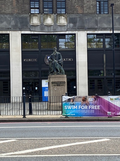 Outside the building is a statue of the local shipowner & philanthropist Richard Green with his faithful Newfoundland dog “Hector”. Green was the principal supporter of schools at Poplar, at which two thousand children were taught and partially clothed.
