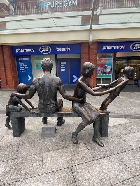 Over the road from the green is Ealing Broadway shopping centre where there are posters about the Ealing Blues Festival that took place in July and explains how much of the music scene originated in Ealing. One of the biggest groups of indie record labels started in Ealing High St and they mention that among the many alumni of Ealing Art School are Freddie Mercury and Ronnie Wood. Marshall amps were first sold in 1962 at 76 Uxbridge Road in Ealing. Outside the shopping centre, in the middle of the town square is a sculpture entitled Teulu (Family Group) by Robert Thomas. The mother and father sit in opposite directions each with a child – one climbs onto the bench and the other is standing.