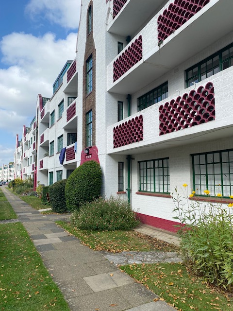 And so to the bus. Alight at this stop and walk round to Ealing Village, a private estate made up of five art deco blocks of flats which were developed in 1934-6. When first built, the flats were rented out but they were made available to buy in 1980. The Village is Grade II listed and is also protected by Ealing Council’s designation as an Area of Special Character of Local Importance.