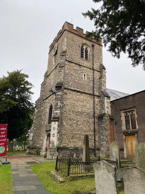 At Edgware station is a large mural saying Stop and Smell the Flowers – it’s by Holly Graham and is “a call to action addressing the climate emergency through the lens of access to clean air and green space”. Walk up the road from the bus station, and find St Margaret of Antioch church. This is also on routes 32, 79 and 107. Just inside the grounds is a grave for Frank Williams, who played the ineffectual vicar in Dad’s Army and further back is a “Saxon Cross” which marks the communal grave where the remains were reinterred of the people whose graves had been unlucky enough to have been caught up in the floods of 1908. The church itself has a medieval tower, dating back to the 14th century and the clock on one of its sides dates from 1756.