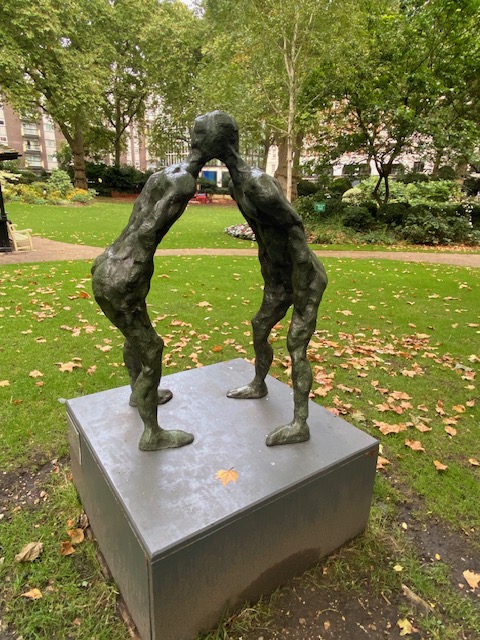Not far away is Portman Square Gardens, a private park in the middle of the square. I was lucky enough to be allowed in by the head gardener but the gates are usually locked. Inside the park are two sculptures, both by artist David Breuer-Weil. The first is entitled Brothers, with two people holding on to each other but pulling in opposite directions. The second is called Brothers II and the sculpture forms a human arch showing the joining of two minds. Described by the artist, “It is an image of coming together, resolution and peace. But, it also offers a suggestion of symbolic meanings showing the arch as a symbol of connection and resolution. Distances between people that were formerly unbridgeable are now connected in less than a second and Brothers expresses this miraculous element of modernity.”