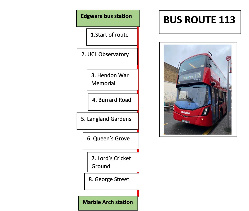 There is no doubt in my mind that this was the most memorable and fascinating route that I’ve travelled on. The highlight was unquestionably the tour of UCL Observatory which was in fact a bonus, as I had expected it to be closed. That said, there were other delights along the way – the massive mural at JW3, both Arts Centres in Hampstead and Camden and the sculptures set within Portman Square Gardens. Even finding out about Samuel Godley in St John’s Wood burial ground was a delight and all this highlights just how special is my project of travelling on all TfL bus routes.