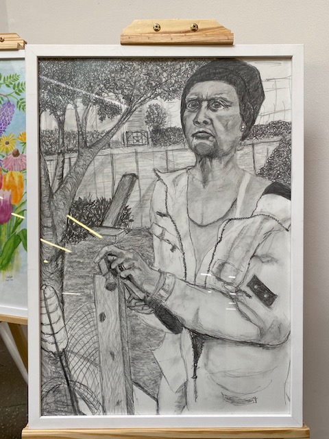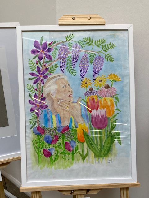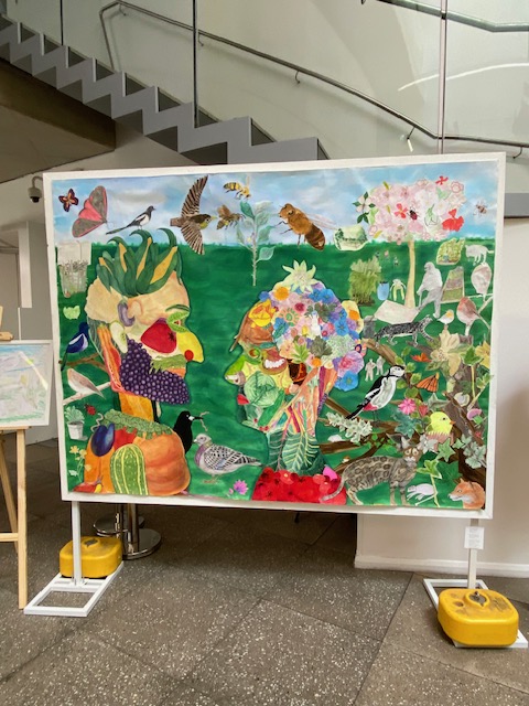 Near the bus stop is Newham Library where there is a small but significant exhibition entitled Up the Allotments! It showcases green heritage-inspired artwork by sixty local people who had attended workshops. One group created a large-scale collaborative collage “The King and Queen of the Allotments”, incorporating individual drawings and paintings inspired by life on the allotments.