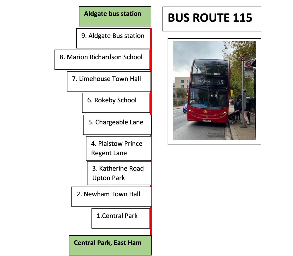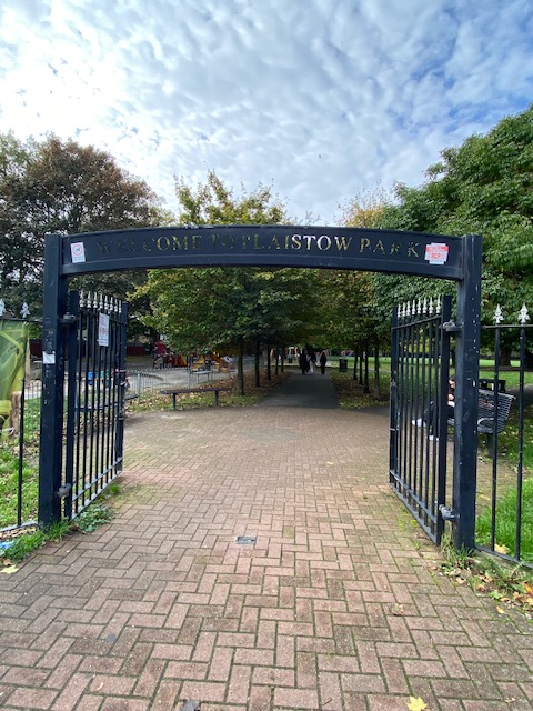 On your way back to the bus stop, pop in to Plaistow Park where there is a delightful mural called Shape Newham – Place of Play. It was developed with a local school and Race Equality charity. They explored Plaistow’s identity and what it means to live there by producing a set of motifs which reflect the area. The name Place of Play is derived from the Old English meaning of Plaistow = a playing place, known for its theatre and recreation.