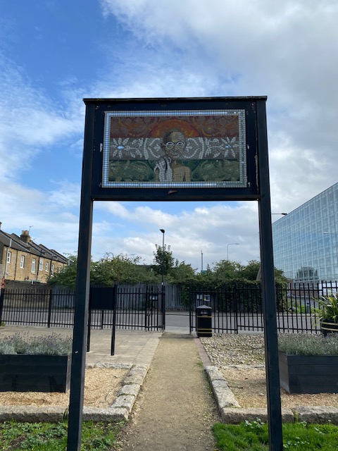 At the other end of the garden is a two-sided panel for Gandhi with one side showing his hand seen sprinkling salt over a map of India. He had led a 24-day walk to the sea to break a UK law on producing salt. The act sparked a wave of civil disobedience resulting in 60,000 arrests and began an international movement of non-violent action. The portrait of Gandhi is set against an Indian flag embellished with a Hindu mandala design. He was in London in 1931 at the second “round table” conference on Indian independence.