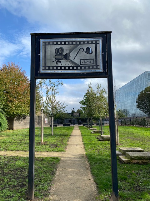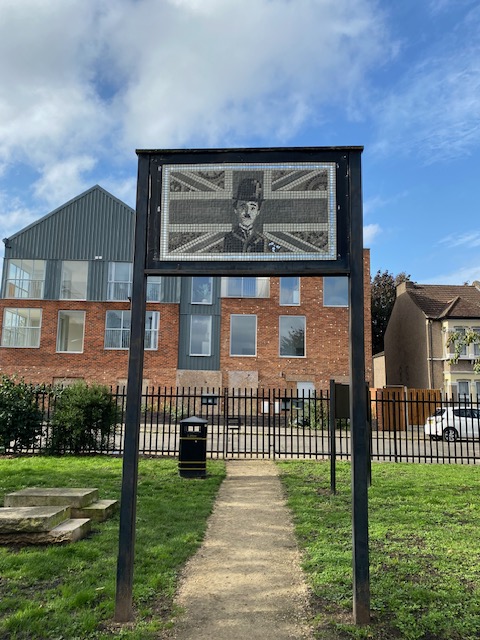 At either end of the park is a double-sided mosaic – one features a portrait of Chaplin of his famous movie character The Tramp against a background of a monochrome British flag. On the other side of the panel is a movie camera projecting his famous hat and cane within a frame of 35mm film reel.