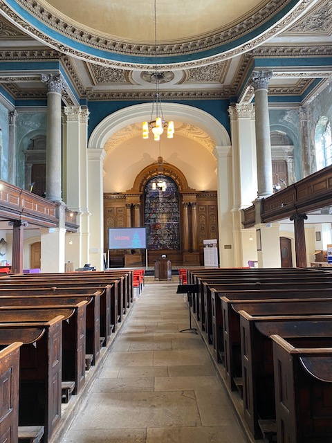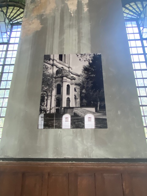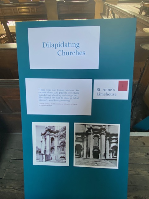 At present (October 2024), there is a small exhibition in the upstairs gallery, about Hawksmoor churches. Of the twelve, three were badly damaged by fire over the 3 centuries since they were built and four were threatened with demolition. Many were left dilapidated through neglect and lack of funds. St Anne’s is still on the at risk register. On the walls in the gallery are some images by artist Helene Binet from her Hawksmoor Churches Collection, and on the way to the gallery, you walk up some original Hawksmoor stairs.