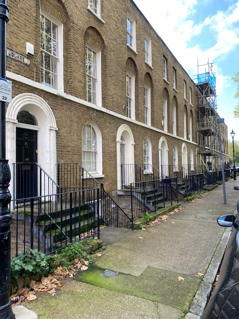Walk round to Arbour Square, a late Georgian square in Stepney. It was laid out as a garden enclosure in 1819 and by 1830, there were buildings on all sides of the square and many of the surrounding roads. The south and west sides of the square are still made up of the original three and four storey Georgian townhouses which are Grade II listed. The east side was demolished and replaced by the Raine’s School building (also Grade II listed) in 1913, while the terrace on the north side was replaced by a block of flats in 1937. The Raine’s School building now houses part of Tower Hamlets College.