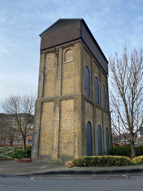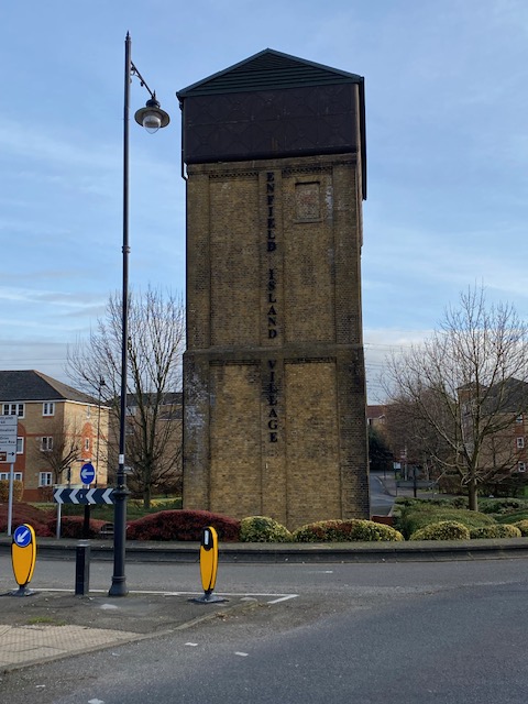 Walk round to the Water Tower which is in the middle of a traffic island and is boarded up now. It was part of the Royal Small Arms Factory which thus had the advantage of water-power to drive the machinery and the proximity of the River Lea Navigation for the transportation by barge of raw materials and finished weapons to the River Thames, 15 miles away, to be loaded onto sailing ships.
