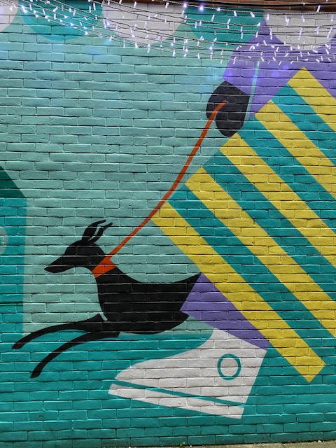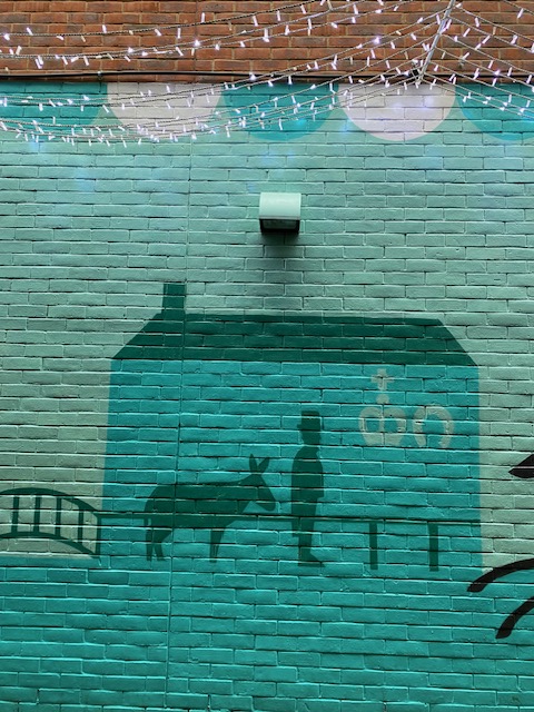 In the alley near the shopping centre, there is a wall covered in art to cheer you on your way. The Enfield murals were the design of students at a local art college. The concept was about celebrating Enfield Town; its history, its people and its heritage. One of the main explorations is Enfield’s history as a market town going back 700 years. It was inspired by the market stalls. The mural features, in the foreground, “a parade of bold silhouettes of people carrying shopping bags”, while in the background there are “illustrations portraying historical buildings, stories and events from the area, celebrate all things Enfield.