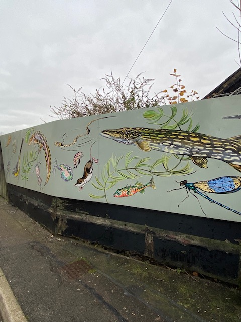 The mural is a representation of the interconnectness of the natural world. Included are all sorts of water creatures Look closely and you can see the orange-striped stonefly; caddis fly; mayfly; grey wagtail; smooth newt; cyclops copepod; grass snake; daphnia water flea with eggs; gammarus freshwater shrimp; water shrew; pike; three-spined stickleback; banded demoiselle damselfly and a kingfisher.