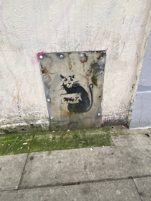 The last murals I found were on the corner of a Poundland shop. Starting with a large gorilla on the left hand side, there is a stencil of a young boy with a spoon over his nose, then an old-fashioned sewing machine on top of a plinth and finally there’s a stencilled graffiti of a rat holding a sign saying “why?” It’s thought that the rat is one by Banksy as it’s in his style, though it’s not definite.