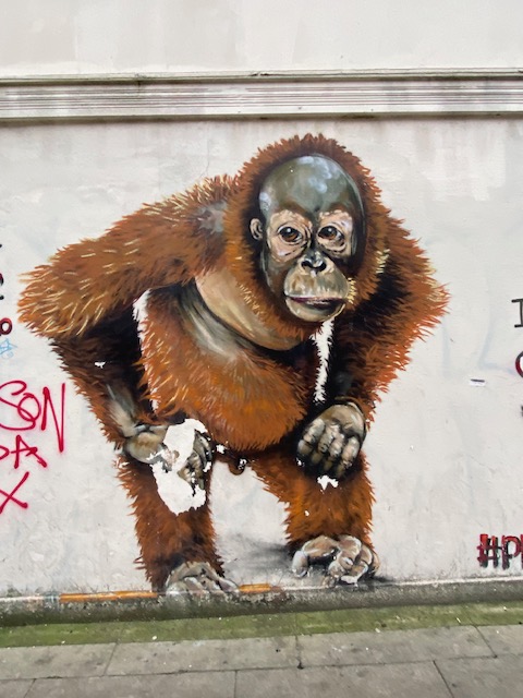 This wall once had a (definite) real Banksy which depicted a young boy crouched over a sewing machine making Jubilee street party bunting in a sweatshop. It was decided by the council to remove the mural and to sell it – almost definitely for a small fortune – in a US auction . Locals were outraged and the mural was withdrawn from the sale. So one assumes that whoever created these latest murals were influenced by the original, taking the boy and a sewing machine as central to the art work. And perhaps the gorilla is a reference to Banksy being regarded as a “guerrilla” artist.