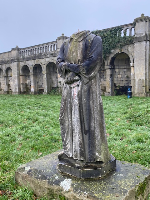 Down from the upper terrace is another stone statue, this one is Dante and sadly he, too, has been decapitated. This headless statue is dressed in fine robes and is holding a scroll.