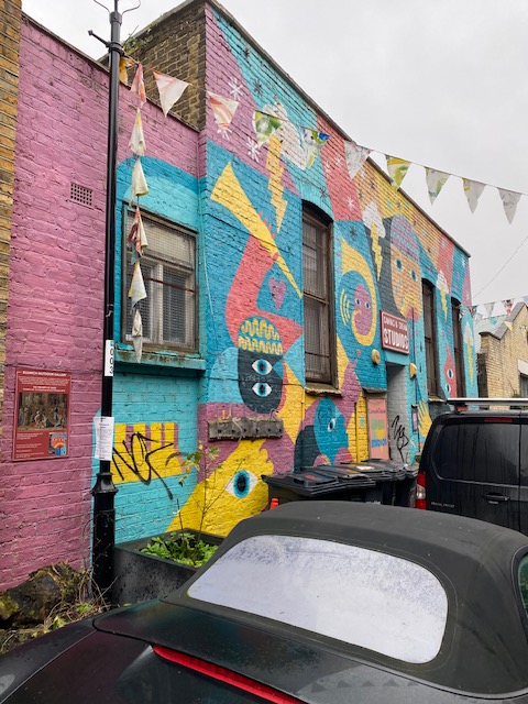 Now make your way to Havelock Walk, where you will immediately see a lively and colourful mural. The Walk is in fact an old mews, now a haven for artists who have adopted its long row of former warehouse buildings. The sculptor David March, who created the falling telephone boxes in Kingston (see bus route 71 for images of this work of art), is a resident of this mews. As well as the jungle mural at the start of the mews, there is another one over the walls and door of the Canvas & Cream studios, with a reference to the Dulwich Outdoor Gallery. The jungle scene that you see on entering Havelock Walk is by London artist Priya Barot, who has a proclivity to painting animals.