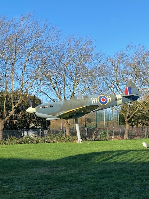 Walk to Montrose Park where you’ll find a Tramshed building, once used to house trams but not any more. This had been the site of an aerodrome, in fact it’s where Louis Bleriot (the first person to cross the channel in a flying machine) had an aerodrome built which he used as a Flying School. A factory was built at the beginning of WWI and in order to aid the transportation of materials, a spur was added. An engine – the Tram – was supplied by the Air Ministry to pull the wagons and carriages and this was stored and serviced in the Tramshed. It’s not obvious if it’s being used at present, as it was locked up. It still looks to be in a reasonable condition so perhaps it has a current use, as it’s bang in the middle of the park.