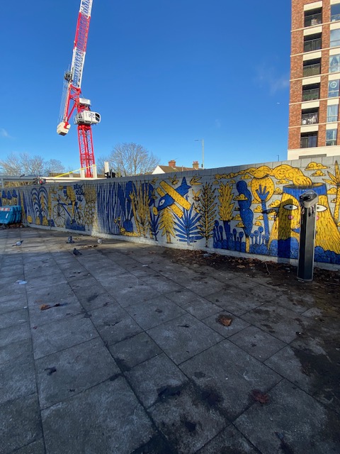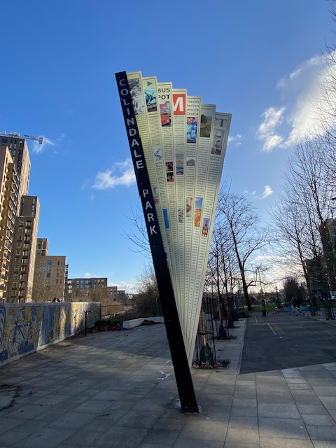 Near the station is Colindale Park, at the entrance of which is a totem fan-shaped sculpture. This shows local information about the area, in a contemporary style. Also nearby is a walk-way with some lovely blue and yellow graffiti to amuse you as you walk to or from the park.