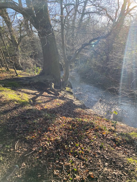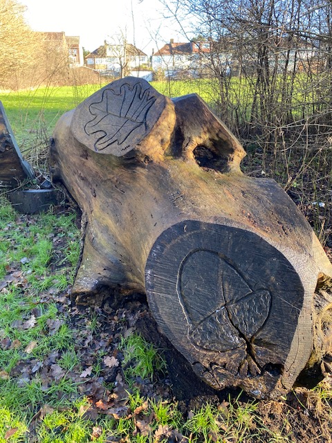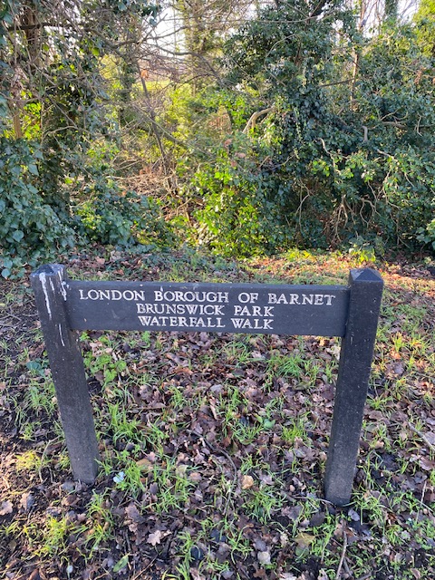 Cross the road from the stop and you’ll see a sign that says Brunswick Park/Waterfall Walk. The walk goes along Pymmes Brook and despite the name, there aren’t any major waterfalls though there’s plenty of water and some weirs. Along the way, you’ll come across a tree trunk from an old oak which has an acorn and oak leaves carved out of the trunk. It’s an easy walk, with plenty of paths and trees. Listen out for the birds as you wander along.