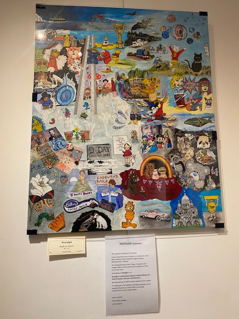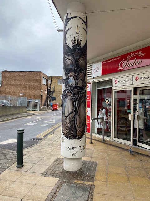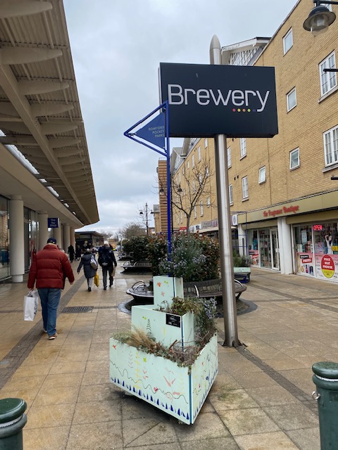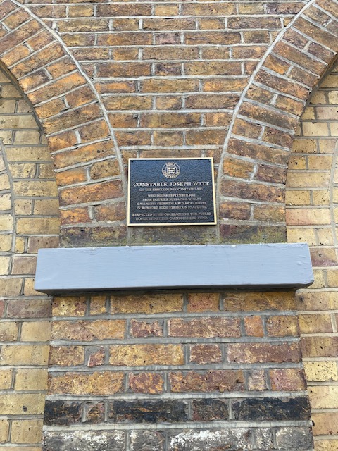 Also around Romford are small plant and flower installations, put together as the Romford Pocket Park. Round the corner from the Centre is Havering Museum, also on bus route 103 – see the blog for information and photos. On the outside wall of the museum is a plaque dedicated to Constable Joseph Watt, who died 8 September 1913 from injuries sustained while stopping a runaway horse. The museum itself is part of the old Romford brewery and there are several references to its origins inside. There are always new exhibitions on show and at present (March 2025) is one in memory of Wendy Pidgeon, a passionate embroiderer who sadly died last year. Also on display is artwork by local artist Joanne Andrew. She paints most subject matter as well as creating collages. There is a magnificent Pearly King costume on show, one that is specifically for a Romford King.