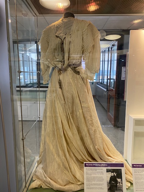 Other showcases had items of clothing from days gone by – one is a dress as worn by Mrs Sarah Ingleby, the last private resident of Valentines Mansion in Ilford. She established a school in Beehive Lane and opened her garden for charitable events. Next to this flowing dress is a replica of a typical dress made from chintz in the 1700s and as worn by the wealthy inhabitants of the local area’s grand houses. Chintz was one of many cotton textiles imported by the East India Company at that time.