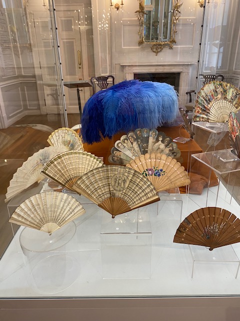 In the permanent display cabinets in the downstairs rooms, many of the fans are folding ones, from all over Europe and Japan; there are some beauties made from mother of pearl and tortoiseshell. Upstairs, the current exhibition is In Performance: Fans of Theatre, Music and Dance, until 31st May 2025. The central cabinet is filled with Dance fans, showing those that are used in dance to emphasise and express movement. There are signature fans, usually brisé fans, showing how fashionable ladies would invite well-known musicians and artists to sign a fan. In particular, do find the Souvenir of the Bal Costumé at Buckingham Palace in May 1842, an English ivory brisé fan.