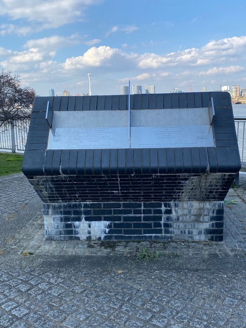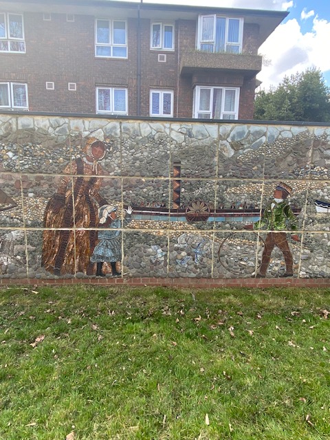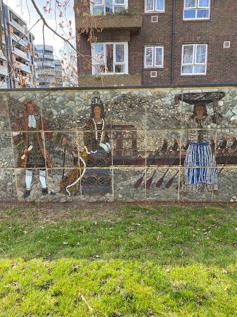 At Glenister Green, moments from the bus stop is a mosaic that was originally commissioned for the Greenwich Hospital. It consists of 60 concrete panels, using glazed and unglazed ceramics and beach pebbles. The theme of the mosaic is “People who have used the river at Greenwich through the ages”. If you look at the mosaic carefully, you can see people from the 18thC with the Royal Barge, from the Age of Sail and Victorian times and finally from the last post-war years of the Docks.