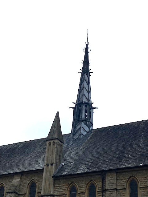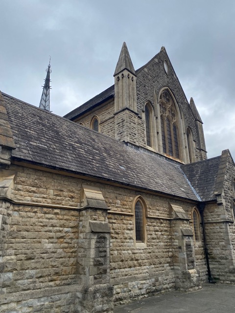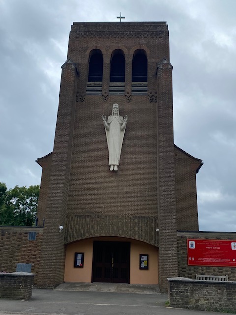Opposite the bus stop is the Sacred Heart & St John the Evangelist church. Over the entrance is an impressive fifteen-foot suspended figure of Jesus and the tower has large buttresses facing the road with three openings near the top on the same face.