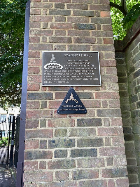 As you turn the corner from the bus stop, you’ll find yourself looking at a gate pillar, once one of a pair. They were entrance gate piers to “Canons” from Old Turnpike Road. The plaque next to the pillar states that it was built in 1712 for James Brydges, first Duke of Chandos. The House (Canons) was demolished in 1740 and existing buildings constructed from salvaged materials. Piers refurbished 1998.