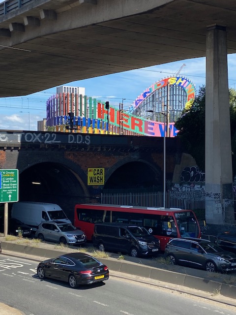Final place to get off the bus is to get a view of the Primary Substation Wrap at Staples Corner. It’s a colourful ‘wrap’ around the sustainable energy substation at Brent Cross Town and is the largest permanent public artwork in the UK. The artwork, titled “Here we come, here we rise,” acts as a landmark and transforms the substation into a visually appealing structure. The new substation is critical to realising Brent Cross’s ambition to be net zero carbon by 2030, providing clean power for homes, offices, retail and leisure spaces.