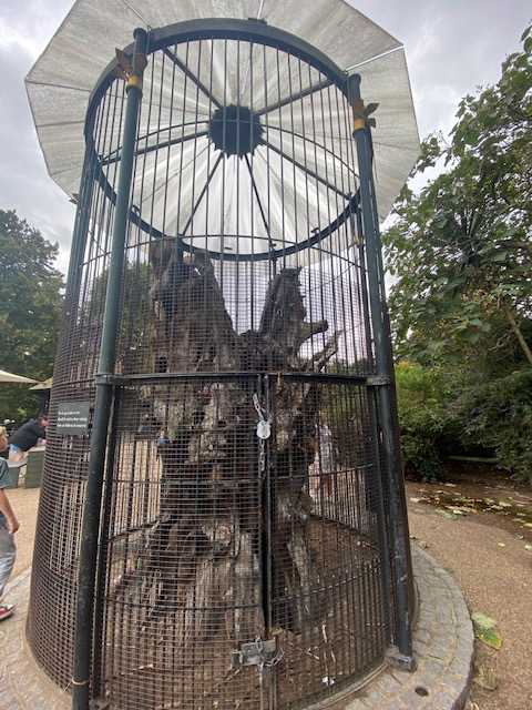 Next to the entrance is the Elfin Oak. It’s the stump of a 900-year-old oak tree that has been carved and painted to look as though elves, gnomes, fairies and small animals are living in its bark. It had originally been in Richmond Park and was moved to Kensington Gardens in 1928 as part of a scheme of public improvements in London. Over the next two years the illustrator Ivor Innes carved the figures of the “Little People” into it.